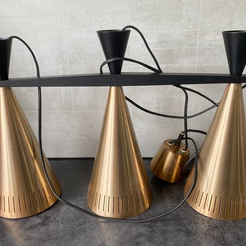 Selger en utrolig vakker og stilren pendellampe som er et ekte blikkfang i rommet. Dette er en svært populær modell som kombinerer matt sort med elegante detaljer i kobber – en kombinasjon som gir både et luksuriøst og lunt preg.