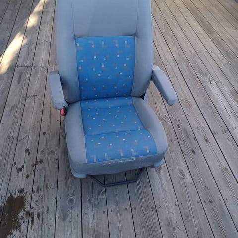 Bilsete i grå tekstil med mønstret midtparti og integrert hodestøtte. Setet har innebygd setebeltefeste på siden. Passer som erstatningssete eller ekstra sete i bil. Passer til T5 og T6