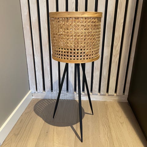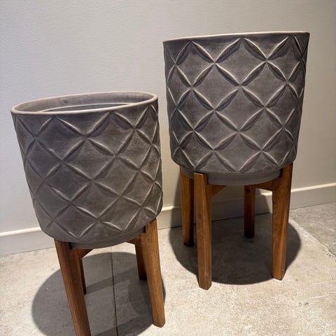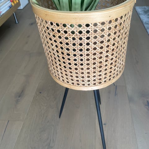 IKEA plantekasser i flettet bambus på ben. Settet består av tre plantekasser i naturfarget bambus med stativ i lyst treverk. Kurvene har åpent flettemønster som gir luft rundt plantene og et dekorativt uttrykk. Egnet til innendørs bruk til potteplanter eller oppbevaring av mindre gjenstander. Passer i stue, gang eller andre oppholdsrom der man ønsker en enkel og naturlig stil.