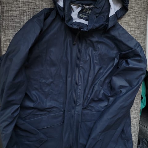 Selger en sort Helly Hansen regnjakke med hette str 140/10år.