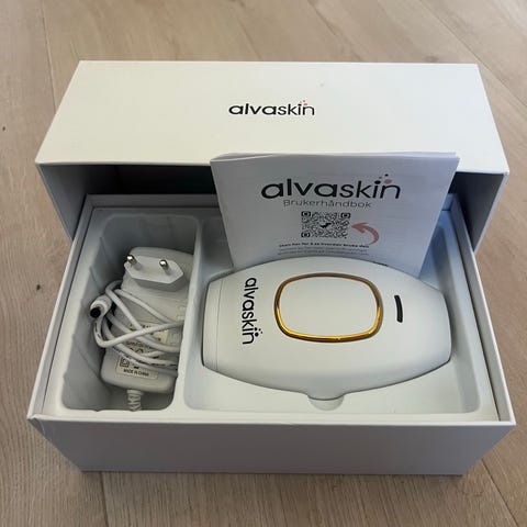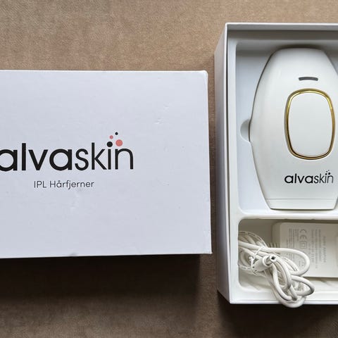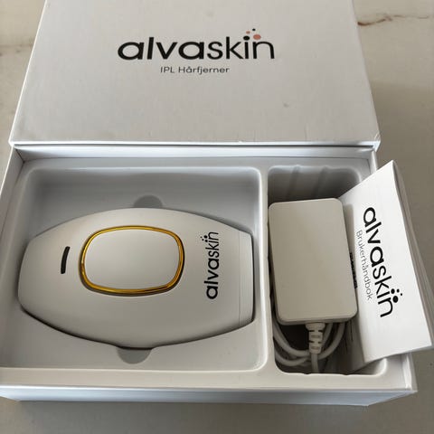 Alvaskin IPL hårfjerningsapparat i hvit farge. Apparatet er beregnet for hårfjerning med lysimpulser (IPL) på kropp. Settet inkluderer hårfjerningsapparat, strømadapter med ledning, reiseveske og bruksanvisning. Egnet for hjemmebruk på flere kroppsområder i henhold til produsentens anbefalinger.