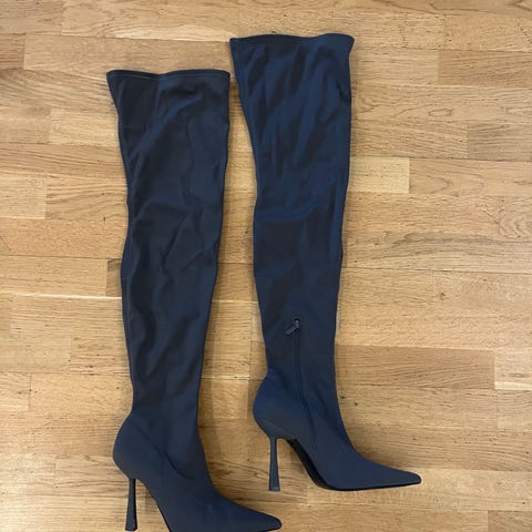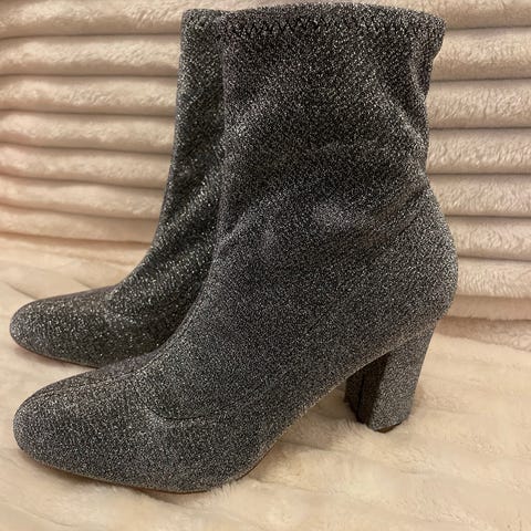 Zara hæler i størrelse 40 i svart glittermateriale. Skoene har høy blokkhæl og sokkelignende overdel som sitter tett rundt ankelen. Overflaten har en glitrende tekstur i mørk tone. Sålen er i syntetisk materiale med hel trukket i svart. Egner seg til bruk ved fest og andre anledninger der man ønsker et mer pyntet uttrykk.