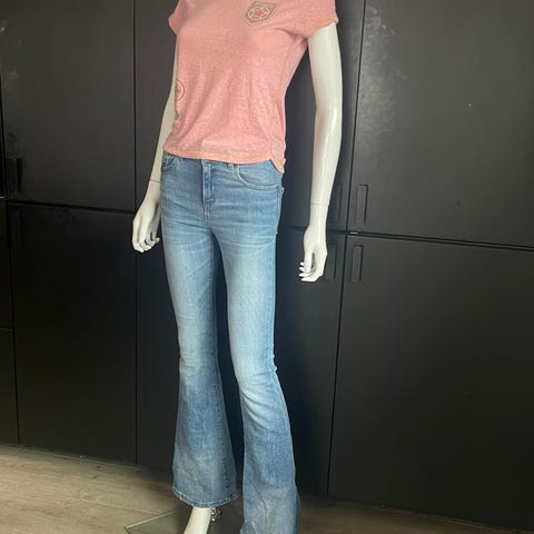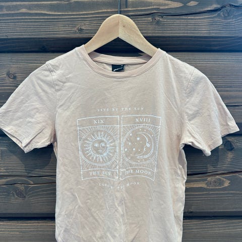T-skjorte i størrelse S. T-skjorten er i en dus rosa farge med dekorative grafiske detaljer, blant annet et lite “Peace”-merke med stjerne på brystet samt trykk på siden.