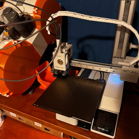 3D‑skriveren er en lukket FDM‑printer med kabinett i grå utførelse. På bildene vises flere spoler med filament i ulike farger, utskiftbare byggeplater og mindre reservedeler/tilbehør. Skriveren egner seg til utskrift av modeller og prototyper i plastfilament på rull.
