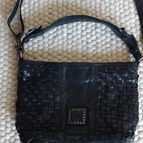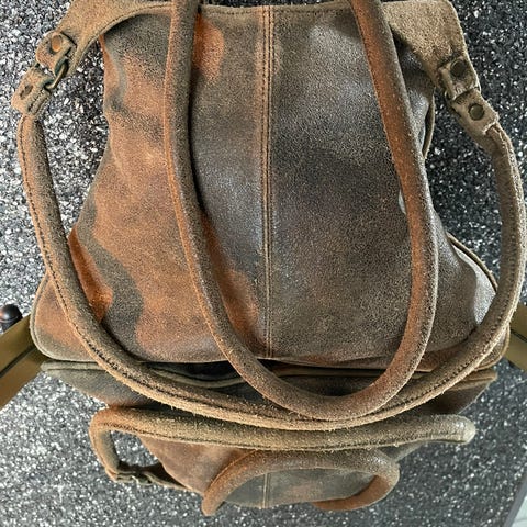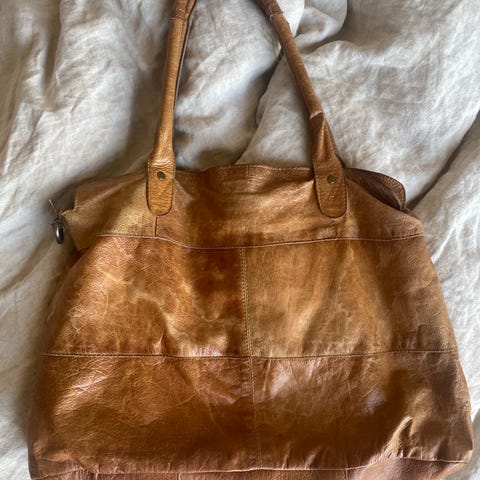 Godt, men pent brukt. Mørk brun med “metallisk” effekt. Liten lomme på innsiden. Noen flekker på foret, men det er mørkt så vises ikke i noen særlig grad. Med hanker og skulderstropp for crossbody-bruk. Ca 40 cm * 40 cm