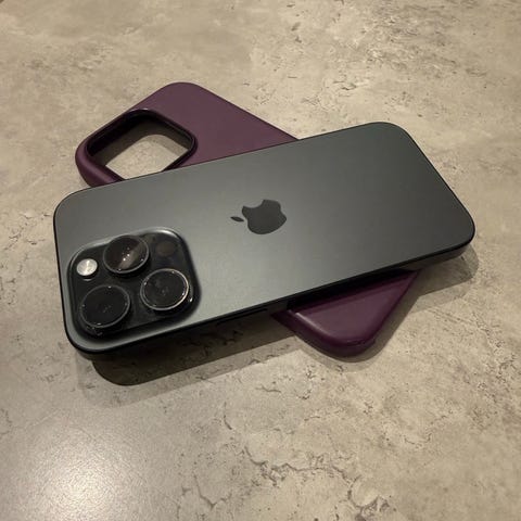 Selger en iPhone 14 Pro Max i fargen Space Black.