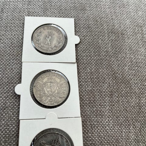 Myntene oppbevares i beskyttende holder og er i fin stand.