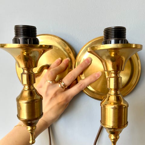 Dette er en vintage vegglampe, sannsynligvis av merket AWF, laget i messing og bakelitt.