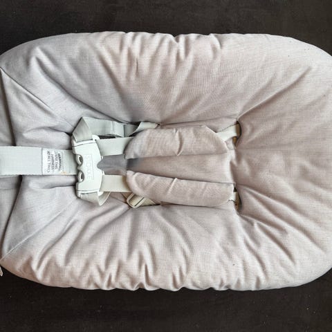 Stokke babystolinnlegg i grå tekstil. Innlegget gir ekstra komfort og støtte til baby i stol eller vippestol. Utstyrt med selefester for sikker montering. Passer til bruk i Stokke-tripp trapp stoler som ekstra polstring og støtte for de minste.