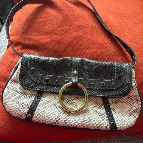 Mønstret overflate i slangeskinnimmitasjon og kontrastdetaljer. Vesken har doble hanker og metallspenne i front.