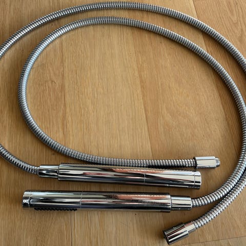 Damixa kjøkkenkran. Kranen er brukt, men fungerer perfekt og er i god stand. Den leverer både varmt og kaldt vann, og selges med nødvendige koblinger som vise på bildet for enkel montering.