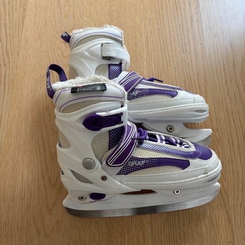 Graf justerbare ishockeyskøyter for barn i hvit og lilla. Skøytene er beregnet for ishockey og har justerbar størrelse, med innstilling rundt størrelse 35-38. Overdelen er i syntetisk materiale med kombinasjon av spenner og borrelås for enkel tilpasning og støtte rundt ankelen.