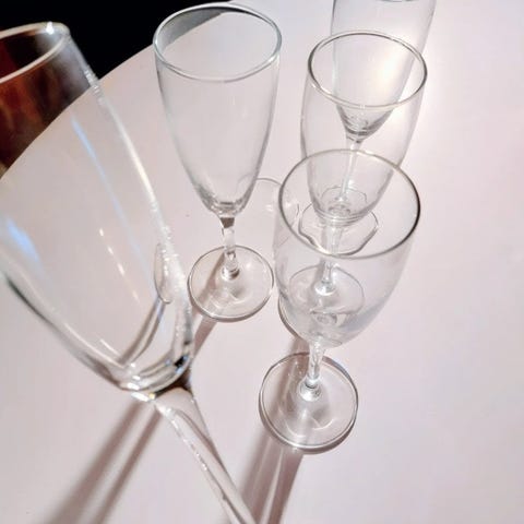Syv hvitvin/champagne glass, tre kopper, snapsglass og diverse andre glass gis vekk i en «pakke». Må hentes. Kun hele kassen, ikke enkelte av dem.