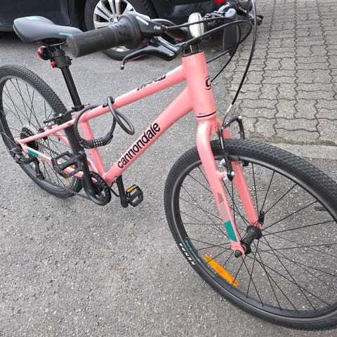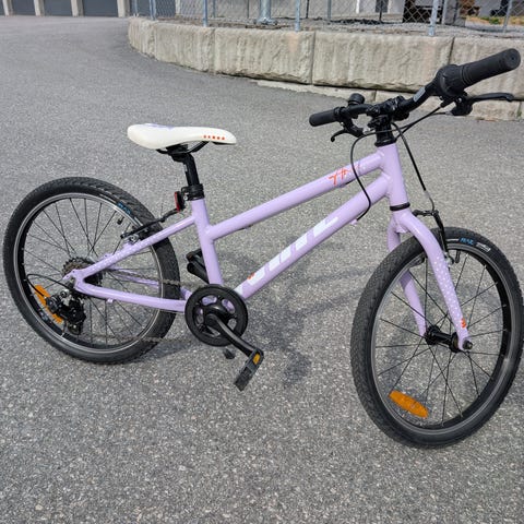 Sykkelen har ramme i lilla farge og sort kurv foran. Setet er lyst med mønster. Utstyrt med håndbremser foran og bak, samt pedaler med refleks.