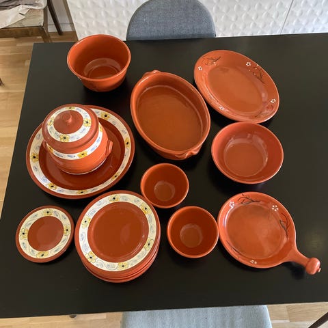 Det selges 6 middagstallerken, 6 suppetallerken og en større fruktskål. Servise er i flott stand gitt at den er laget ca 50-60 år siden, men to av suppetallerkener har et lite skår. Se de to siste bildene.