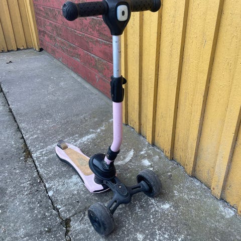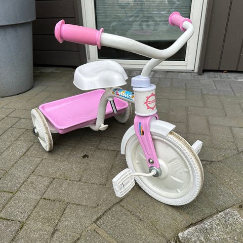 Barne trehjulssykkel med 10" hjul. Sykkelen har rosa ramme og hvite detaljer på sete, styre og hjul. Egnet for små barn som skal øve balanse og koordinasjon på tre hjul. Passer til bruk på jevnt underlag som gårdsplass eller gangvei.