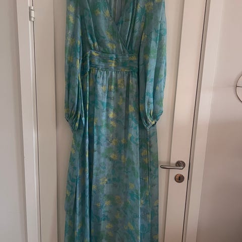 byTiMo kjole for dame i størrelse L. Kjolen er flerfarget med blomsterprint på sort bunn og har lange ermer med strikk nederst. Modellen har løs passform med volangdetaljer nederst på skjørtet. Kjolen er laget i 100 % viskose, i utmerket stand.