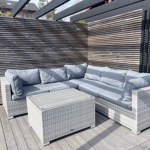 Meget pent brukt. Kjøpt nytt i 2020. Kan settes sammen på flere ulike måter. Trekket på putene er nyvasket (det er de mørkegrå putene på bildet som følger med). Stått lagret innomhus. Ikke brukt de siste 3-4 årene.