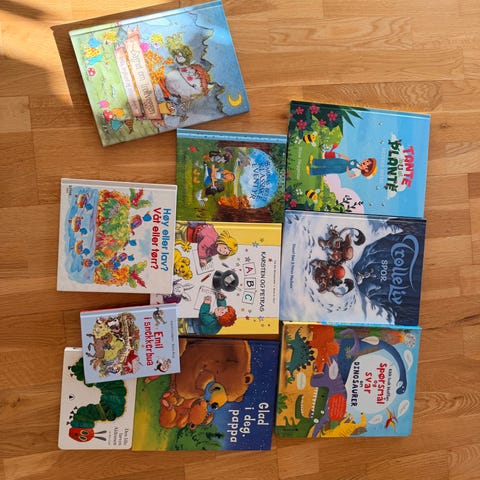Pakke med ulike barnebøker i norsk utgave. Blant titlene som vises på bildene er blant annet «Den hemmelige hagen» illustrert av Inga Moore, «Monster Maud – Helsprøtt pysjamasparty», «Monster Maud – Den store skrekken», «Mustafas kiosk og andre rim for barn» samt «Hodja fra Pjort». Bøkene er illustrerte barnebøker egnet for høytlesning eller egenlesning for barn, med varierende temaer som fantasi, humor, rim og fortellinger fra ulike miljøer.