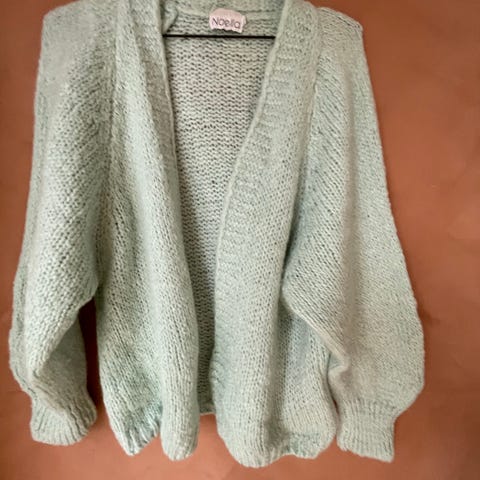Kjempefin sitrongul/ limegrønn jakke i mohairull for dame i one size. Jakken er gul og har en løs, åpen fasong uten lukking foran. Den har vide ermer og en myk, strikket struktur. På bildet vises også en dekorativ brosje festet på jakken; denne kan være avtagbar og bør avklares ved salg. Passer som et lett ytterplagg eller som en varmende lag-på-lag-jakke innendørs.