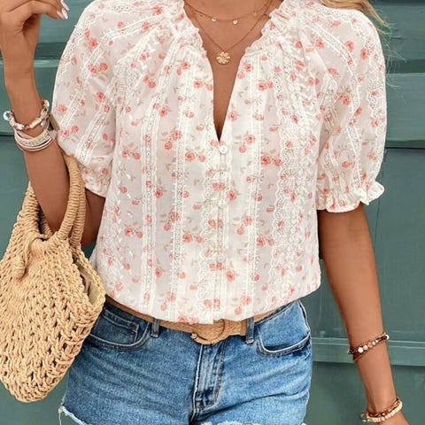 Shein topp for dame i størrelse xs. Toppen er blå og laget av polyester. Den har dyp V-utringning, korte ermer og markert midje med bredt parti som gir en innsvinget fasong. Nederdelen av toppen er lett utsvingt. Passer til bruk sammen med bukser eller skjørt i hverdagen eller til en mer pyntet anledning.