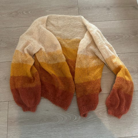 Hjemmestrikket cardigan i en tråd mohair og en tråd merinoull. Pynteknapper på armene.