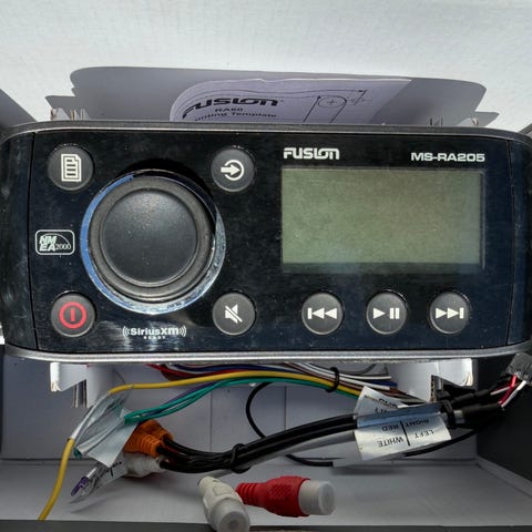 Fusion MS-RA205 er en kompakt, IPx5-sertifisert marinestyring (93 mm dybde) med NMEA 2000-tilkobling, innebygd forsterker og 2,3-tommers LCD-skjerm. Den støtter FM/AM, VHF, USB, AUX.Radioen er designet for tøffe maritime miljøer med aluminiumschassis