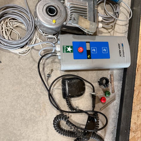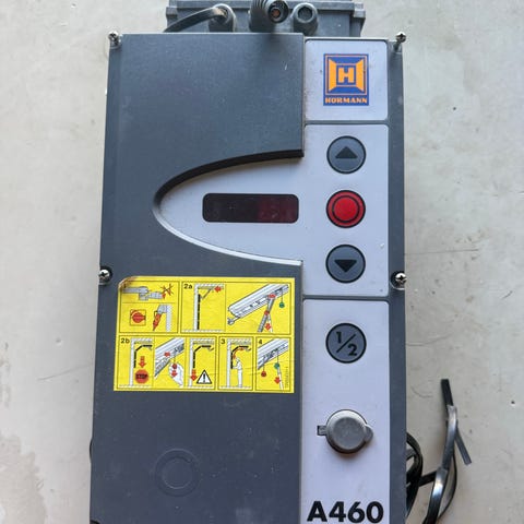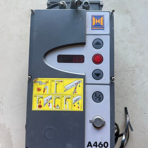 Hörmann WA400 portåpner motor med styreenhet og tilhørende komponenter. Industriell motorenhet for portdrift, merket WA400, med elektrisk tilkobling 230/400 V AC, 50 Hz. Leveres med styreboks, kabler og diverse monteringsdeler slik som braketter og kjede. Egnet som reservedel eller komponent i et portåpningssystem for industriporter eller garasjeporter der denne typen motor benyttes.