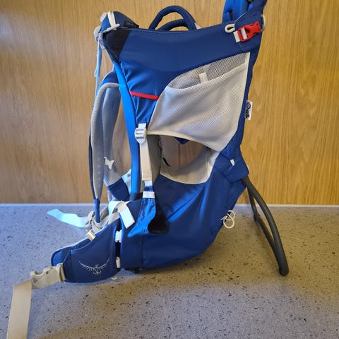 Osprey Poco AG premium bæremeis i blå farge. Modellen har bæresystem med nettingrygg og polstrede skulderstropper for god ventilasjon og komfort. Justerbar rygglengde og hoftebelte gir tilpasning til bærer. Bæremeisen har integrert barnesete med polstrede seler og støtte rundt barnet. Flere utvendige lommer og festepunkter gir plass til utstyr. Egnet til tur og hverdagsbruk der barn skal bæres over lengre distanser.