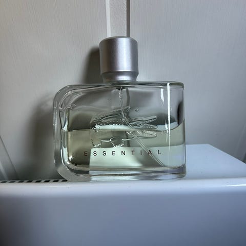 Lacoste Essential parfyme. Flasken har rektangulær form med gjennomsiktig glass og metallfarget kork. Dufttypen er en herreparfyme/eau de toilette med lys, klar væske. Egnet til daglig bruk eller ved spesielle anledninger. Tror det er igjen 115 ml.