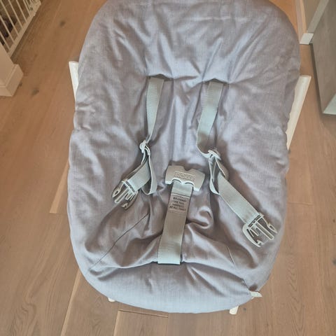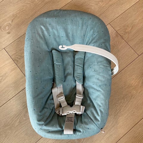 Jeg selger et pent brukt stokke tripp trapp newbornsete. Lekebøyle og et trekk følger med på kjøpet (jeg har også et blått mønstret trekk som kan fås med for 70 kr ekstra om ønskelig).