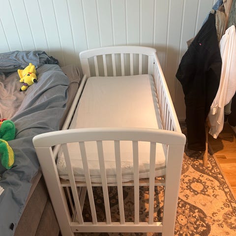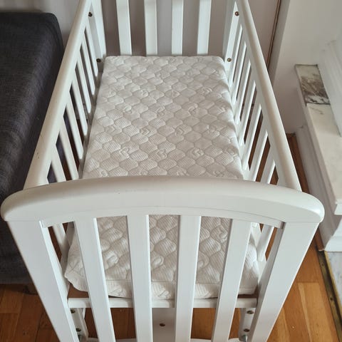 Selger en hvit sprinkelseng. Justerbar i 3 høyder. Ingen flekker på madrass