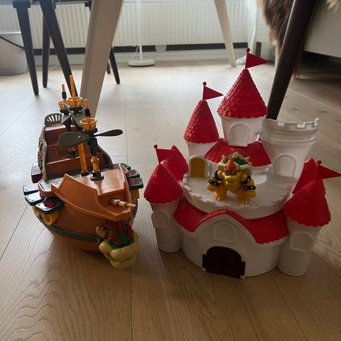 Super Mario lekesett Bowser luftskip lekebåt i plast. Figuren forestiller Bowsers luftskip fra Super Mario-universet, med detaljer som propeller, kanoner og karakterhode i baugen. Lekebåten har flere nivåer og åpne flater som gjør det mulig å plassere figurer om bord (figurer følger ikke nødvendigvis med). Egnet som lekesett for barn som liker Super Mario-tema og fantasifull rollelek.