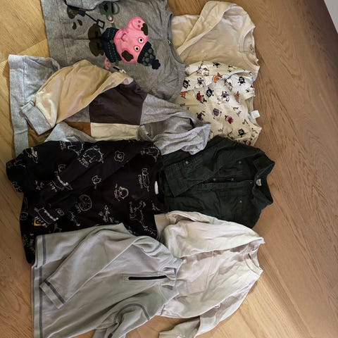2 bukser, 4 bodyer, to gensere i ull, en kjole og en bunadsskjorte