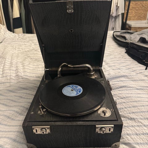 Edison Bell grammofon integrert i trebordskap. Kabinettet er i mørkt tre med utskårne dører i front og oppfellbart lokk. Inne i skapet står en manuell platespiller til 78-plater, med mekanisk arm og betjeningshjul. Det følger med en samling 78-plater som ligger i og ved spilleren. Møbelet har hylle nederst for oppbevaring av plater eller tilbehør. Egner seg som bruksgjenstand for den som har riktig utstyr og kompetanse til vedlikehold, eller som dekorativt møbel og samlerobjekt innen eldre lydutstyr.