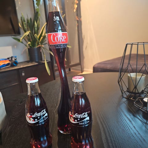2 uåpnede eldre coca-cola flasker, 18 og 19 cm. høye. Som bilde viser noe svinn i innholdet. Selges samlet kr. 120 + frakt med posten.