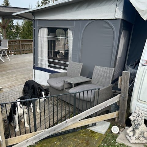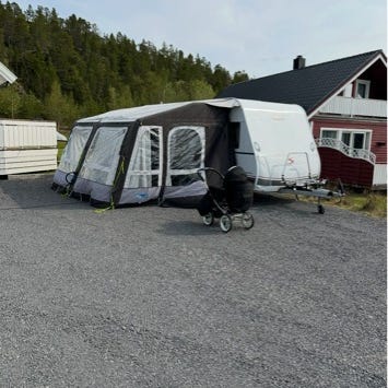 Fortelt til campingvogn i grå og mørk grå farge. Teltet har rette vegger med store vindusflater i plast på både front og sider, samt døråpning i front. Nederst er det en mørk teltkant/skjørt som beskytter mot fukt og skitt. Forteltet festes til campingvognen langs siden og støttes opp med stenger og barduner. Egner seg som ekstra oppholdsrom eller lagringsplass ved campingvogn.