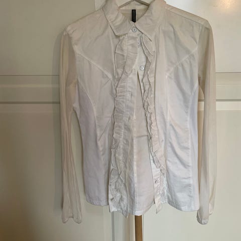 Part Two bluse for dame i størrelse M. Blusen er hvit og laget av bomull. Modellen har lange ermer og krage, samt volangdetaljer foran. Passer til bruk både til hverdags og mer formelle anledninger, og kan kombineres med både bukser og skjørt. Helt ny, nypris kr 1000,-.