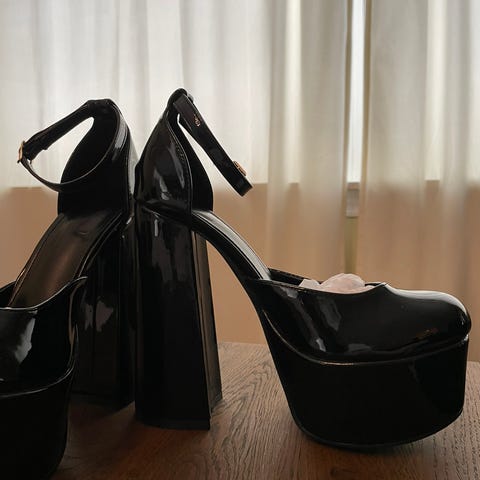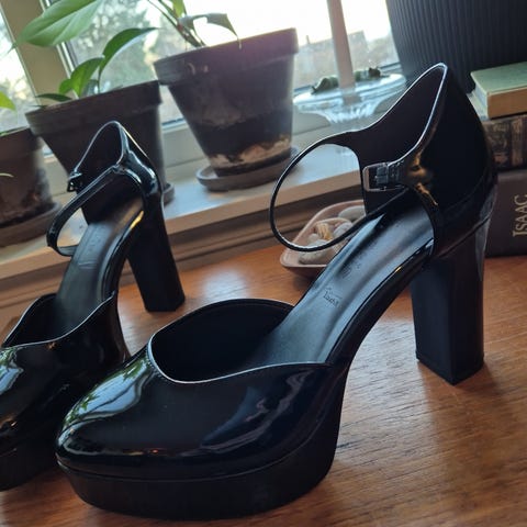 Tamaris hæler i størrelse 37. Skoene er laget i svart lakkmateriale med høy blokkhæl og platåsåle. Modellen har rund tå og ankelrem med spenne for justering. Passer som pensko eller til antrekk der man ønsker høyere hæl og et mer markert uttrykk.