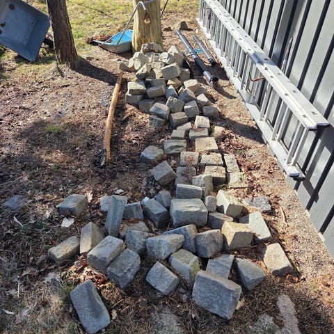 En del år gamle ubrukte kantstein selges samlet kr 15 pr stk. Ant. 150+ er laget av grovkornet betong og har en grå natursteinlignende overflate. Steiner, lengde 60cm stablet ligger på palle. Passer til ulike uteprosjekter som hagemur, avgrensning av bed eller andre konstruksjoner der det er behov for solide betongelementer.