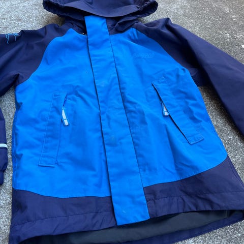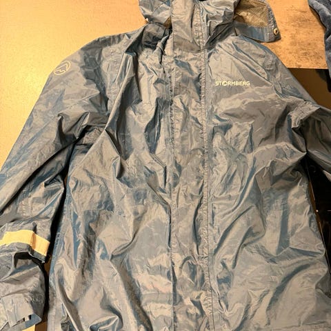 Stormberg jakke størrelse 12 år. Jakken har praktiske glidelåslommer foran og borrelås stramming på ermene. Hetten kan strammes rundt ansiktet og bak. Det er to små skader, den ene er på kanten bak og den andre er på siden nesten på kanten.