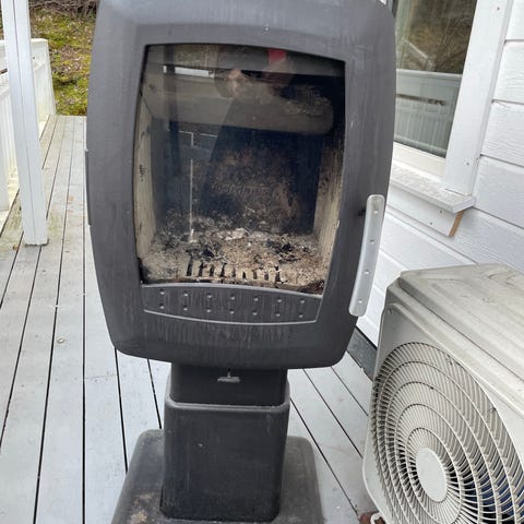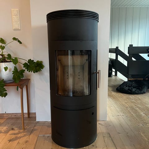 Frittstående vedovn i grå metallkonstruksjon. Ovnen har frontdør med glassfelt og rist i brennkammeret. Det er askeskuff nederst for oppsamling av aske. Røykuttak er plassert på toppen med tilkoblet røykrør i stål. Egnet som oppvarmingskilde i bolig, hytte eller garasje der det er tilrettelagt for vedfyring og godkjent pipe-/røykkanal.
