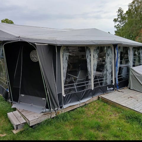 Forteltet har grå og hvite paneler med store vindusflater og hvite gardiner. Inneområdet gir god plass til sittegruppe og oppbevaring.