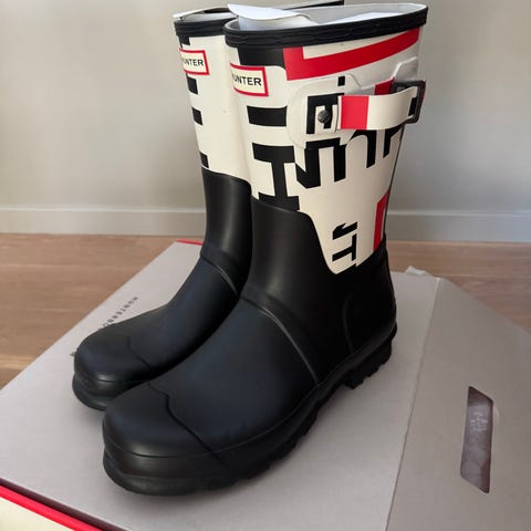 Hunter regnstøvler i størrelse 44. Klassiske, halvhøye gummistøvler i svart gummi med kraftig såle. Modellen har drahempe bak for enklere av- og påkledning og tekstilfôr på innsiden. Passer til bruk på regnværsdager, i vått terreng og til hverdagsbruk der det er behov for vanntett fottøy.