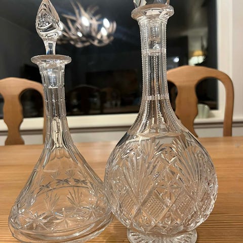 Diverse boller og karafler i gammelt glass/krystall