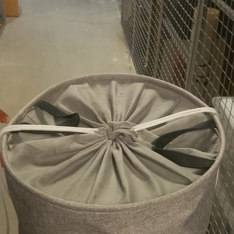 Skittentøyskurv i grå tekstil med sammenleggbart stativ i metall. Kurven har håndtak på sidene for enkel flytting og kan brettes sammen når den ikke er i bruk. Egnet til oppbevaring av skittentøy eller annen tekstiloppbevaring i soverom, bad eller vaskerom.