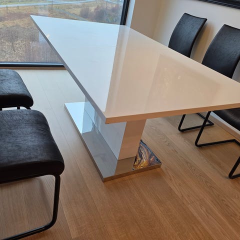 Hvitt spisebord kjøpt for 4 år siden fra Trendnom for 8000 kr. Selger bordet da jeg flyttet inn i ny leilighet. Bordet er i utmerket stand, solid og har en glassplate som gir et elegant utseende. Kan forhandle om prisen ved rask byttehandel.