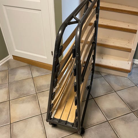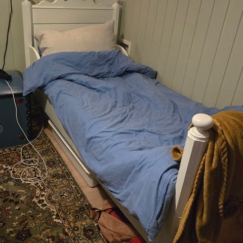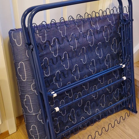 Velsig lite brukt Jysk Båjum gjesteseng med liggemål 80 x 190 cm. Sengen har sammenleggbart metallstativ med hjul for enkel flytting og oppbevaring. Ribbebunn i tre og madrass i antrasittfarget trekk med sikksakkmønster. Høyde på sengen er ca. 33 cm. Egnet som ekstra seng eller gjesteseng i hjemmet, på hytta eller i andre rom der det er behov for en enkel soveplass som kan foldes sammen når den ikke er i bruk.