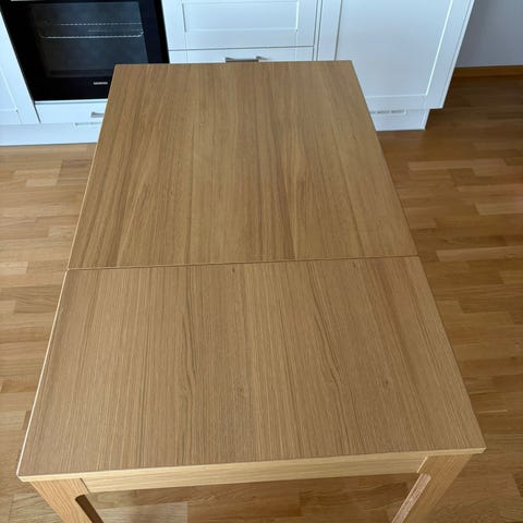 Spisebord / kjøkkenbord i eik. Klaff følger med. Klaffen er 44x80 cm.
