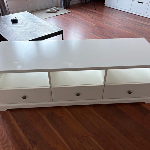 Selger en pent brukt TV-benk fra Ikea med noen bittesmå hakk, men uten større skader. Den måler 140 cm i bredden og 44,5 cm i dybden. Må hentes